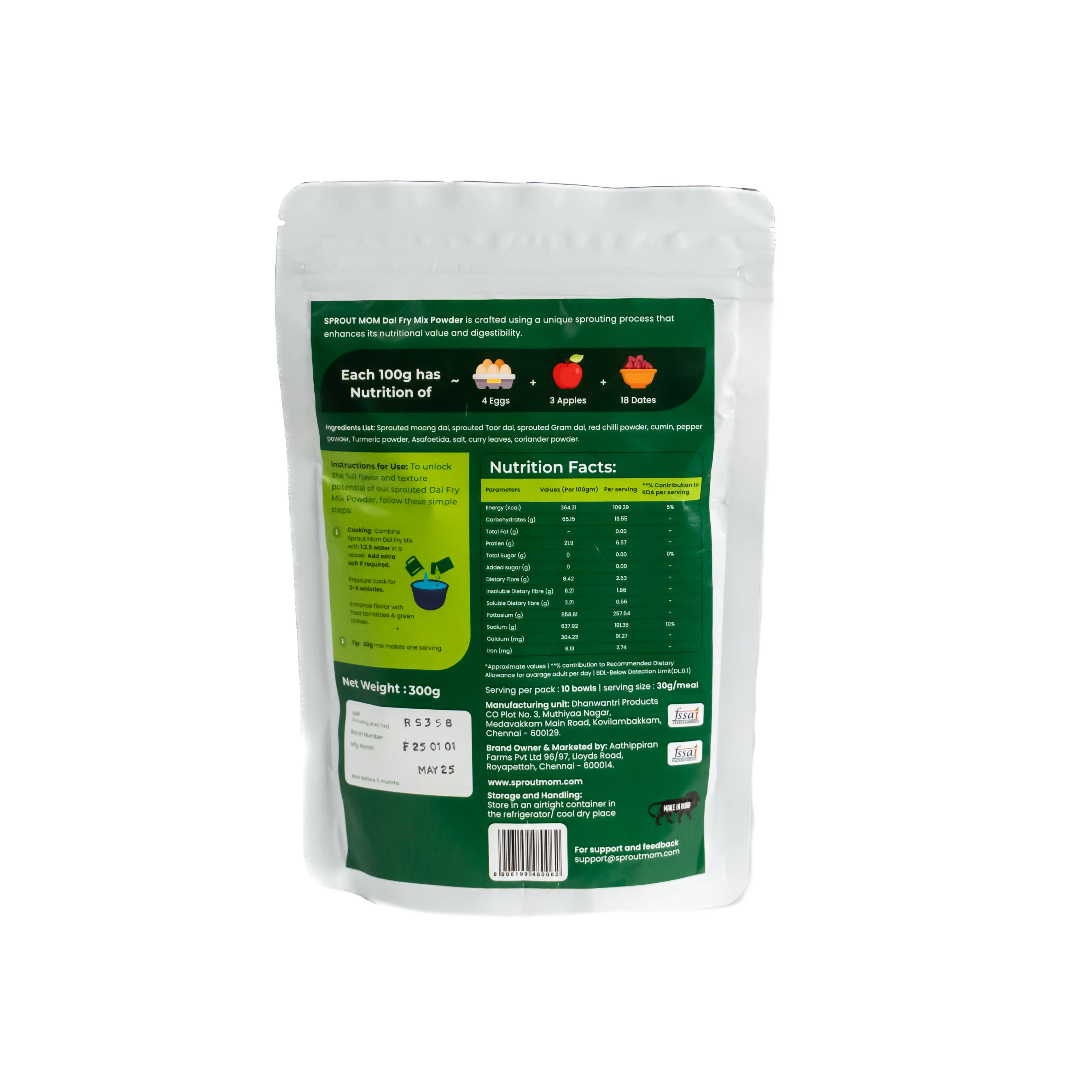 Sprouting unlocks the full nutritional potential of lentils. It naturally enhances their protein content, boosts absorption of essential minerals like iron and zinc, and reduces anti nutrients like pythic acid that typically hinder digestion. The result? Rich in quality protein, iron and dietary fibre. High bioavailability. Better gut health and digestion. No bloating.